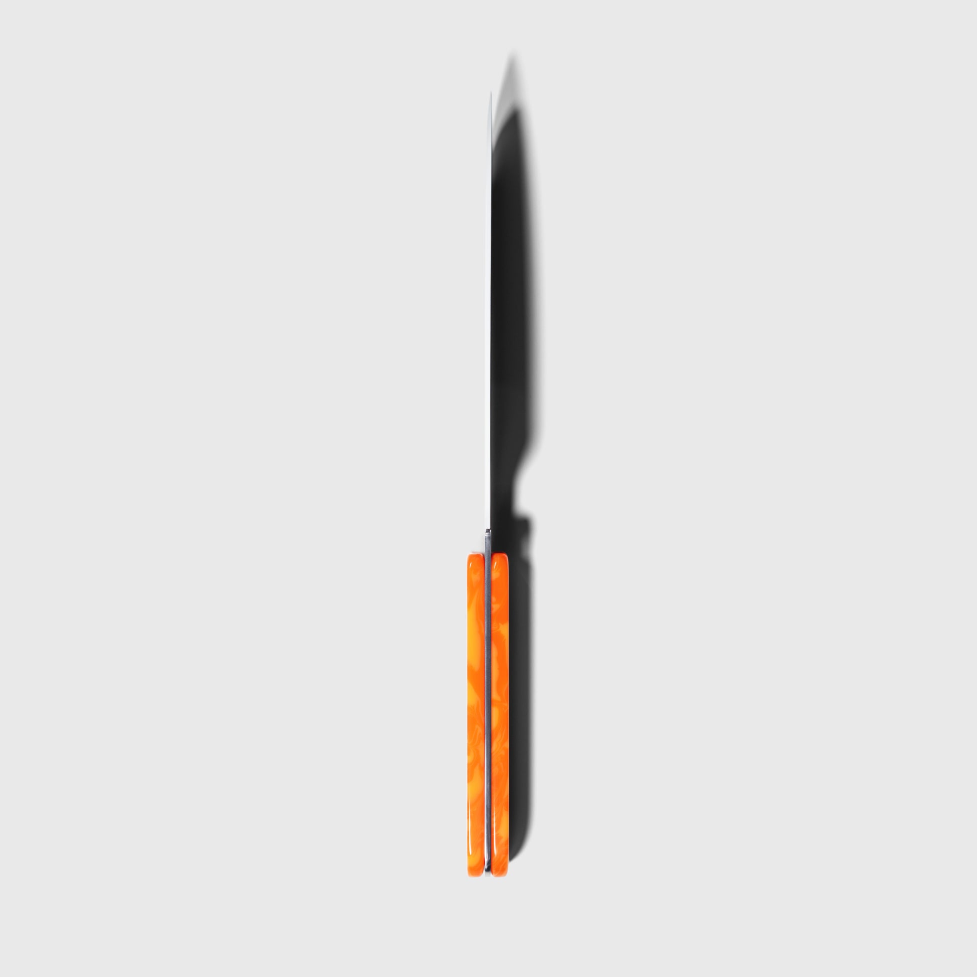 A versatile 165 mm kitchen knife that handles most slicing, dicing and mincing tasks with ease. Its simple, geometric silhouette features a bio-resin handle (partly made from vegetable waste) available in handmade, marbled patterns or solid color. With core steel hardened to 62 HRC, it offers exceptional sharpness and durability. Designed for a natural pinch grip, the Santoku’s balance point sits just forward of the handle for good control and comfort. A light sandblasted finish and engraved nomi logo complete the blade.